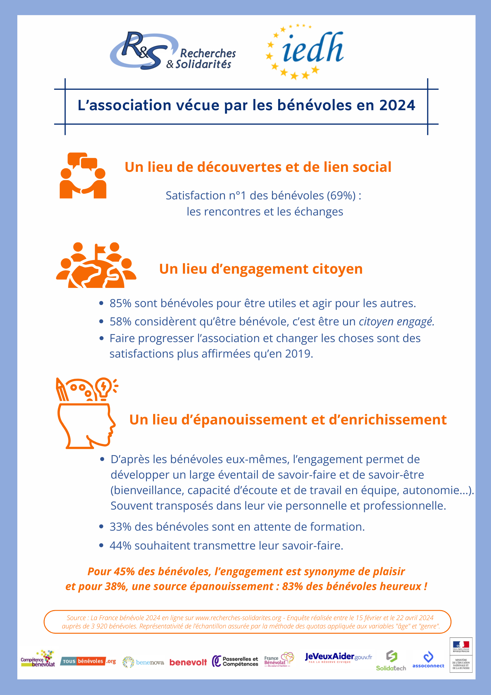 N.B. L’édition 2025 de la France bénévole s’appuie d’une part sur une enquête IFOP – France Bénévolat / Recherches et Solidarités (4 646 français interrogés en janvier 2025) et le Baromètre d’Opinion des Bénévoles (20 000 témoignages de bénévoles interrogés) .